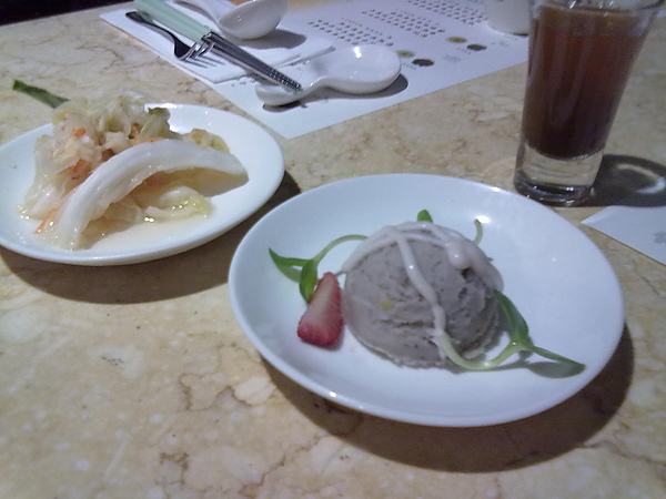 套餐的前菜芋泥~旁邊是我另外加點的茶香泡菜~不過吃起來並沒有茶的味道~= ="