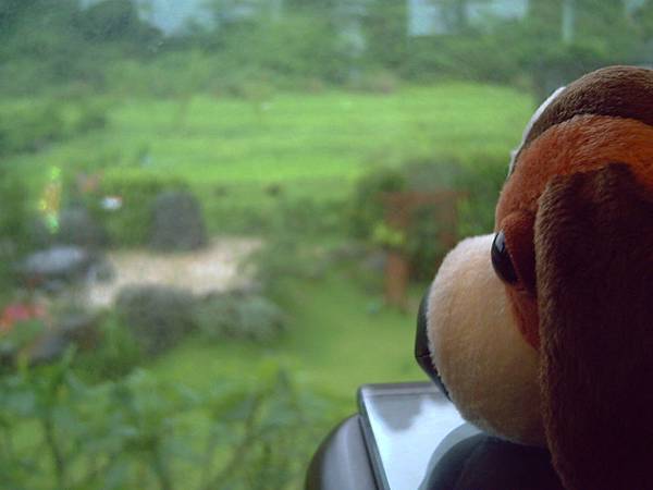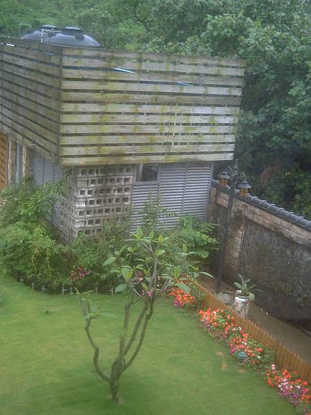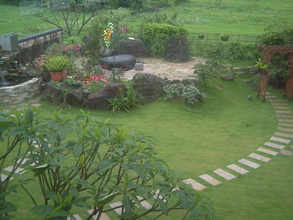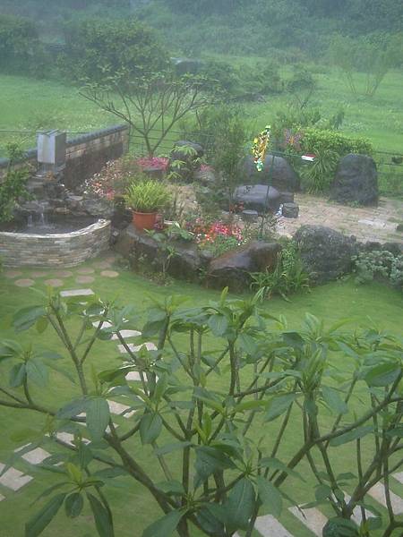 窗外看到的是一個綠油油的草坪地~要不是因為下雨~我還真想讓阿笨在下面跑跑呢~