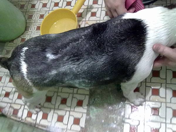 將稀釋過後的黑肥皂淋在大小姐身上~用洗毛刷幫大小姐刷刷洗洗兼按摩~