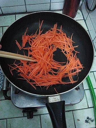 接著熱鍋~加入沙拉油~等油熱後倒入紅蘿蔔拌炒~並加入適量清水悶煮至軟~