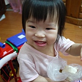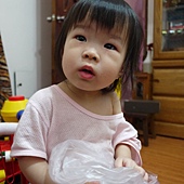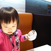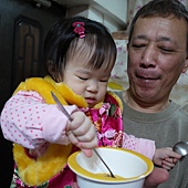 這個月吃飯進步好多啊~除了太大塊的菜跟肉還是不吃外~花椰菜~豬肝~雞蛋~小肉末~都會吃了~老爺燉的中藥雞湯~裡面的枸杞她也會吃~雖然餐具用的還是哩哩落落的~但是命中率比上個月好很多~現在也很愛學人想拿筷子吃東西~