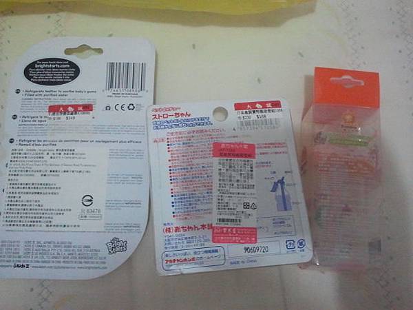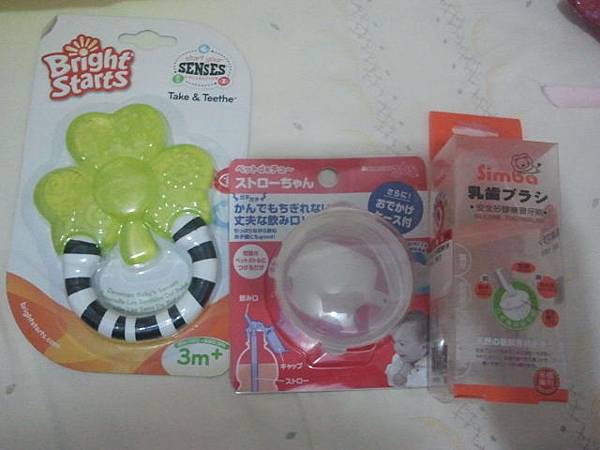 由左而右~分別是裡面有液體的固齒器可以拿去冷藏後給小孩咬疏緩長牙的不適~中間是盒裝保特瓶吸管組~右邊是小獅王辛巴的乳齒牙刷~