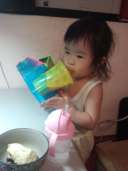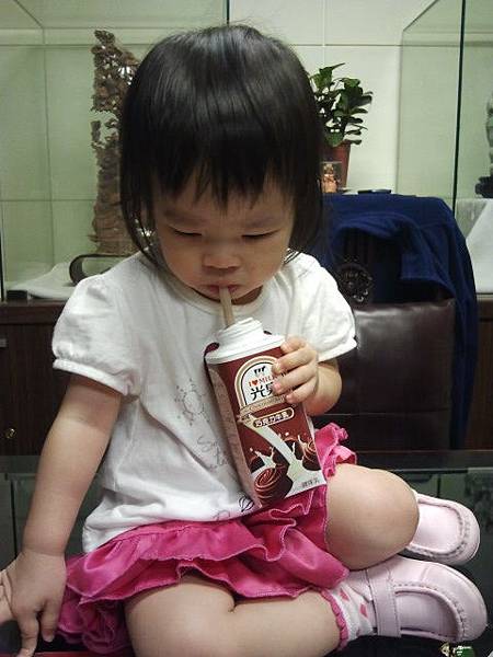 用防拔吸管喝巧克力牛奶~(其實是懶的洗杯子~直接用吸管插給她喝)