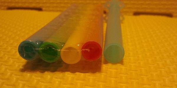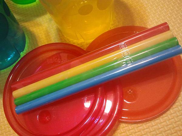 這四隻彩色吸管是杯子原本附的硬式吸管~很硬很粗 不過兩邊都是平頭的~如果要戳飲料會有點困難~不過這麼硬 就不怕小孩子愛咬咬把吸管咬爛不好吸~這種硬的吸管也可以重覆使用~