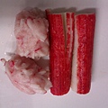 作法:將蟹肉棒、蝦肉球、蝦子燙熟;蟹肉棒跟蝦瘦球切成小丁備用。