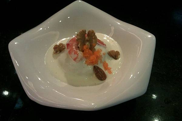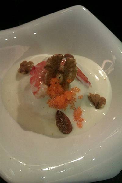 將馬鈴薯泥加入小叮的蟹肉棒跟蝦肉球拌勻,弄成球狀後裝盤,鋪上小黃瓜絲淋上優格,在放上蝦子與萬歲牌無調味核桃杏仁擺盤即完成。