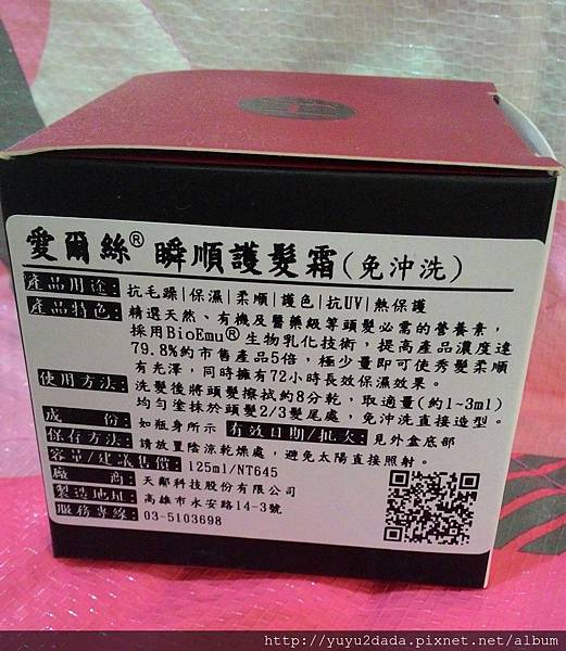 這次體驗愛爾絲的瞬順護髮霜~免沖洗~塗抹在頭髮上後沒有油膩感~反而有種順暢柔滑的清爽感~頭髮也帶有一種淡淡的清香味~因為是5倍濃縮也不需要塗抹太多~