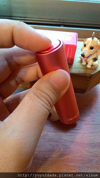 而且唇膏本身有一個超讚的設計~要從頂端按下去~唇膏本身才會從下方彈跳出來~這樣放在化妝包也很安全~也不怕被家中小孩拿來"彩繪"啊~