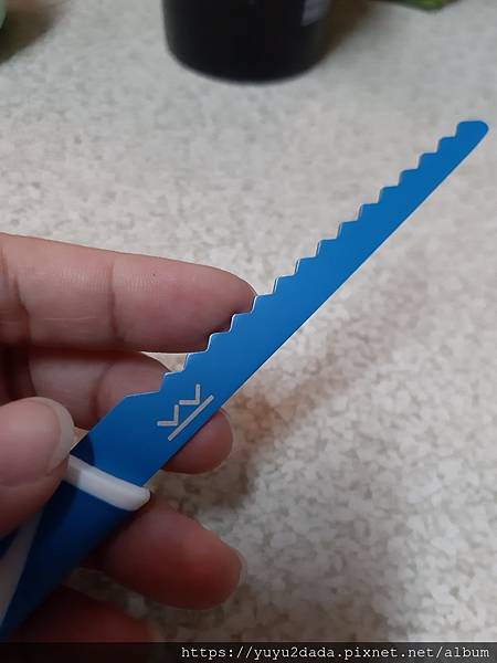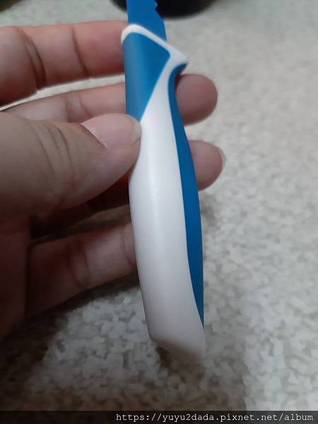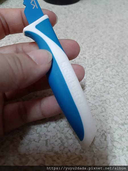 藍白配色的刀體,刀片是藍色的鋸齒不鏽鋼。
