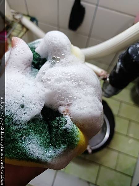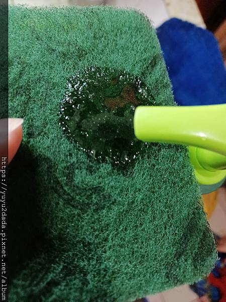 不會很稠的液體肥皂~擠到菜瓜布上面~~