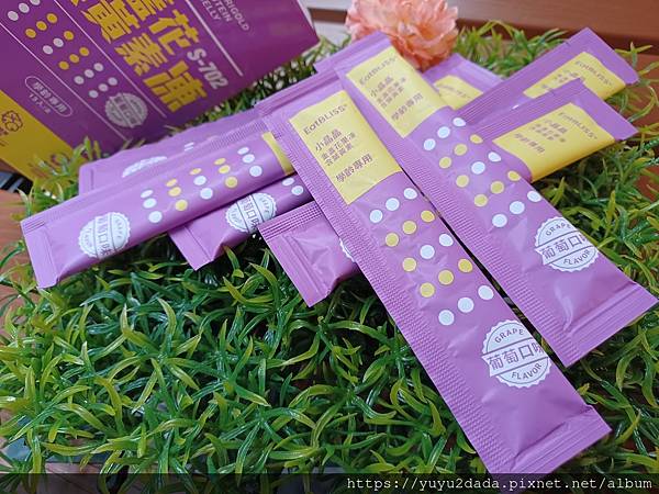 每一包都跟跟外盒包裝是一樣的紫黃色系風格~