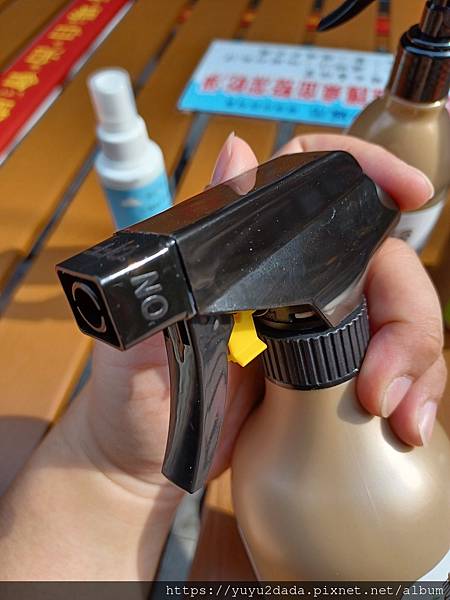 噴霧瓶上都有ON、OFF開關,還貼心的附有黃色的小卡扣,避免誤觸。